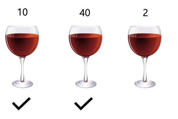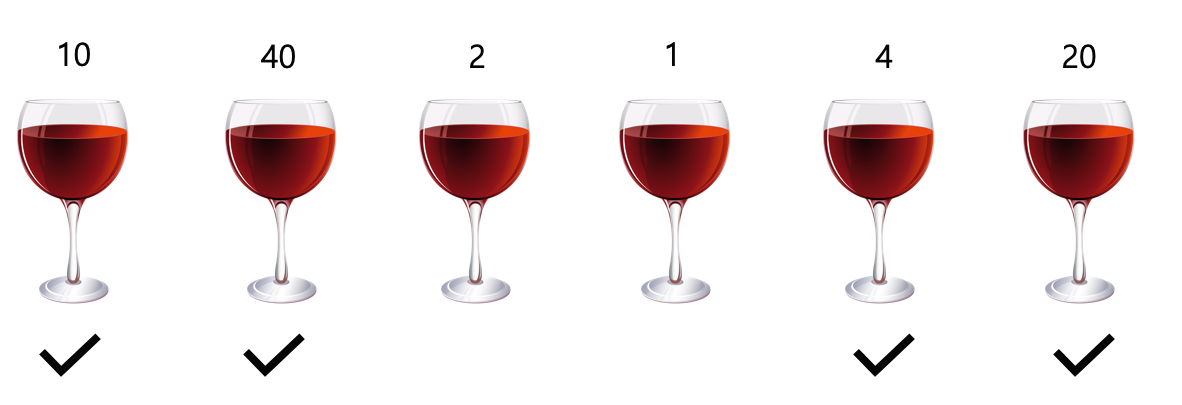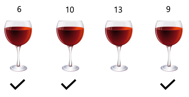 예를 들어 6개의 포도주 잔이 있고, 각각의 잔에 순서대로 6, 10, 13, 9, 8, 1 만큼의 포도주가 들어 있을 때, 첫 번째, 두 번째, 네 번째, 다섯 번째 포도주 잔을 선택하면 총 포도주 양이 33으로 최대로 마실 수 있다.