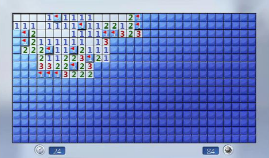 그래서 최소한의 클릭으로 지뢰가 없는 칸을 모두 오픈하려면 0인 곳부터 클릭해서 오픈한다.(재귀적으로 주변 8칸 중 0이 있으면 그 주변도 오픈함) 0인 칸을 모두 오픈했으면 나머지 지뢰가 아니고 오픈하지 않은 칸은 클릭했을 때 해당 칸만 열리기 때문에 남은 칸(공개되지 않은 칸) 중 지뢰가 아닌 칸의 숫자를 더한 것이 최소한의 클릭이 된다.