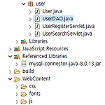 JSP에서 AJAX를 이용하여 회원등록 페이지를 만들어보겠습니다. 1. 프로젝트 구성 프로젝트 구성은 이렇게 됩니다. index라는 jsp파일 하나와 java 서블릿클래스 2개, db연동을 위한 DAO클래스 1개, User라는 자바클래스 하나로 이루어져있습니다. 부트스트랩을 다운받아서 webContent밑에 css, fonts, js파일을 넣어주었습니다. 2.프로젝트 실행화면 및 동작 프로젝트를 완성하면 이런 웹페이지가 뜹니다. 페이지에는 회원의 이름, 나이, 성별, 이메일이 나와있습니다. 그리고 그 아래에는 회원 등록 양식이 있고 그 부분을 작성해서 등록버튼을 누르면 바로 위에 회원 목록에 추가되는것을 볼 수 있습니다. Ajax를 이용하여 화면이 새로고침되지 않아도 바로 바뀌는 것을 확인할 수 있습니다..